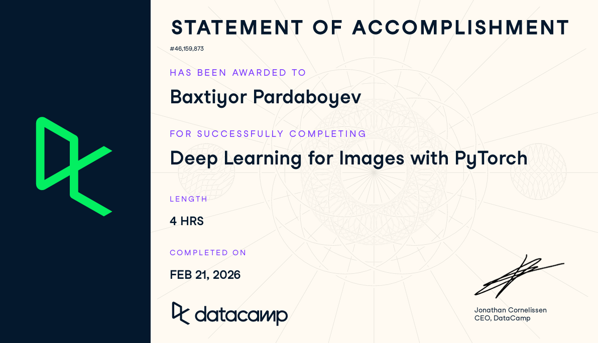 Currently studying at Tashkent University of Information Technologies with a focus on Artificial Intelligence. My interests include computer vision, deep learning, model training and evaluation, and data analysis & visualization.