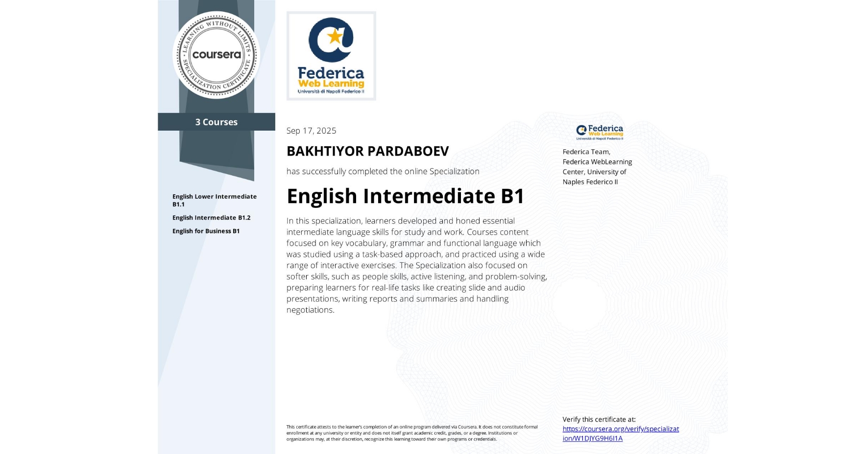 English Intermediate B1 Specialization
